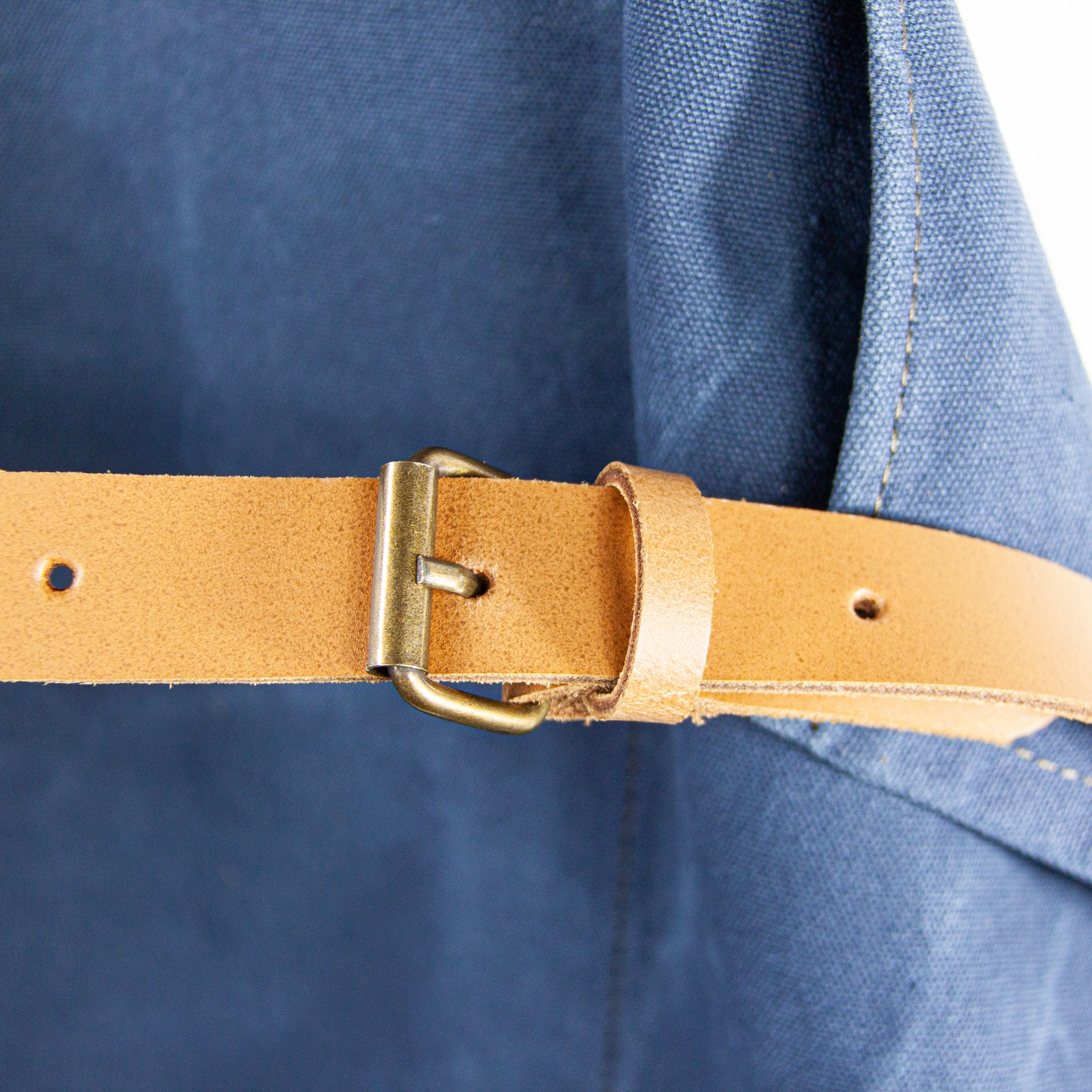 • Cinto de couro castanho claro com fivela metálica numa peça de tecido azul