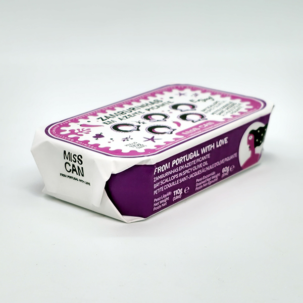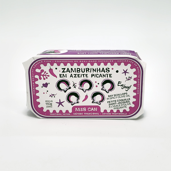 • Lata de zamburinhas em azeite picante MISS CAN com design púrpura e branco