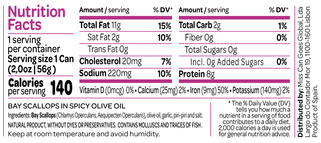 • Tabela nutricional de Bay Scallops em azeite de oliva picante