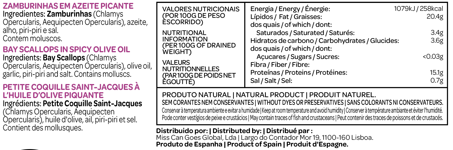 • Etiqueta de embalagem de zamburinhas em azeite picante com ingredientes e informações nutricionais multilíngues